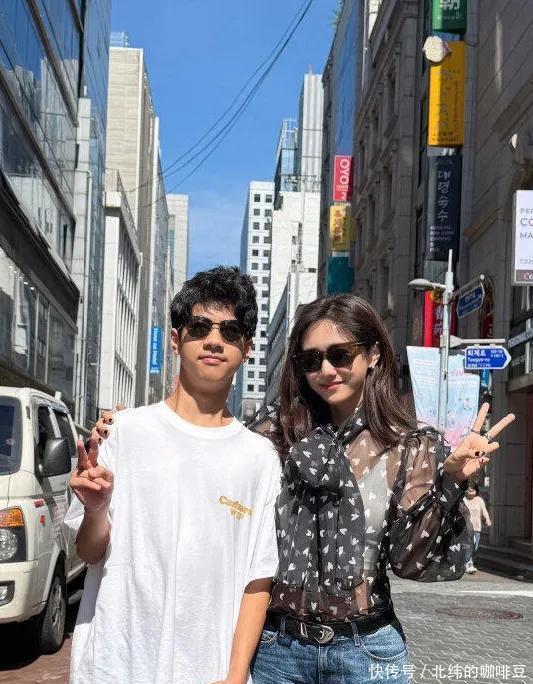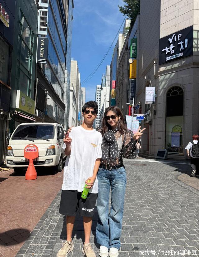 Jagger换上白色T恤戴上黑色墨镜立马帅气很多,15岁的他比刘芸高很多,他应该快有175cm了。刘芸搂着儿子拍照,眼里都是骄傲。