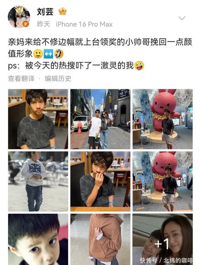 Jagger这张在日本领奖的照片拍的太丑了,15岁的他邋里邋遢的。刘芸看到后,立马发了几张儿子好看的照片。修了图的Jagger变得阳光快乐了不少,他烫了卷发,眉眼里有郑钧年轻时不羁的劲儿。