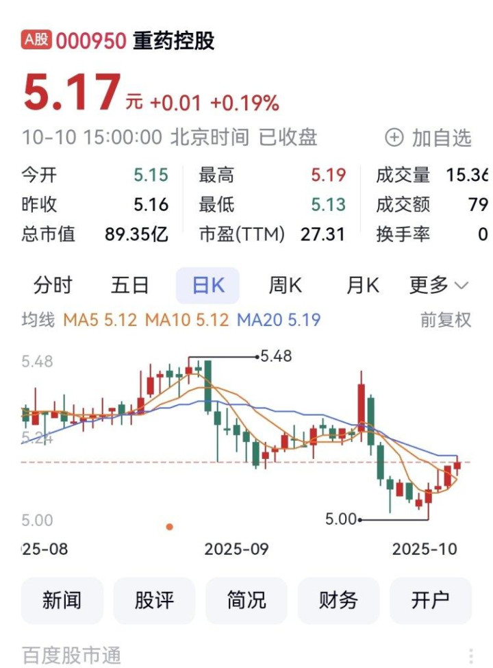 10月10日,重药控股报收5.17元,涨0.19%,滚动市盈率27.31,市值89.35亿元。